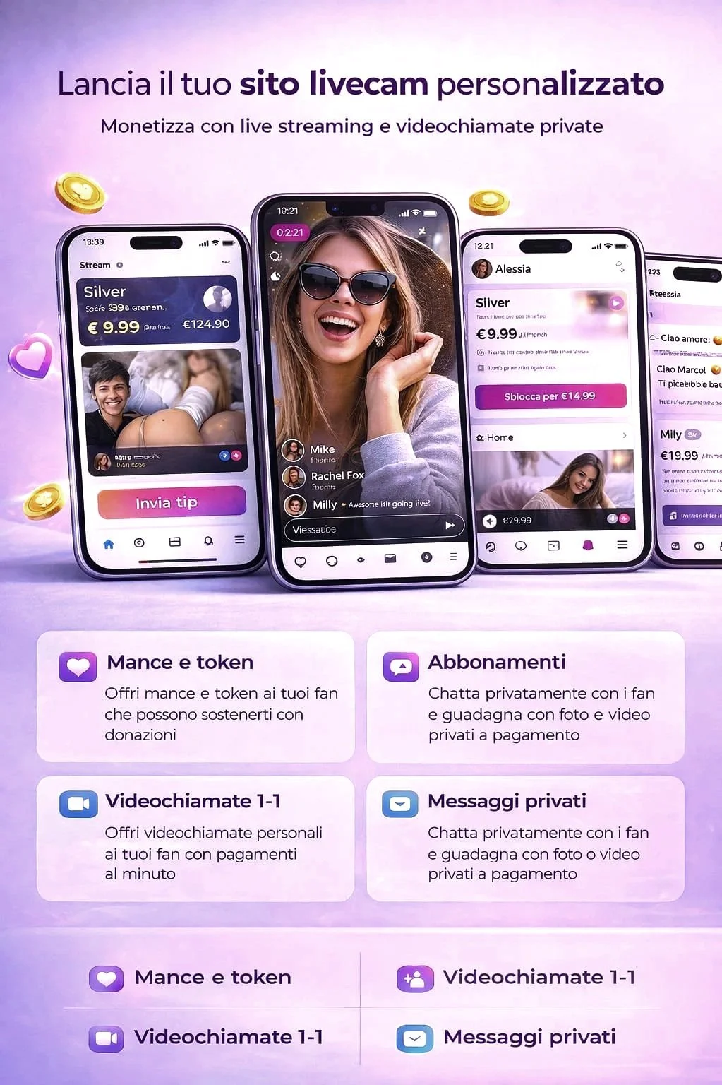 Piattaforme di live streaming con creator e performer, con sistemi di chat, streaming live e monetizzazione tramite sessioni private, tips e contenuti.