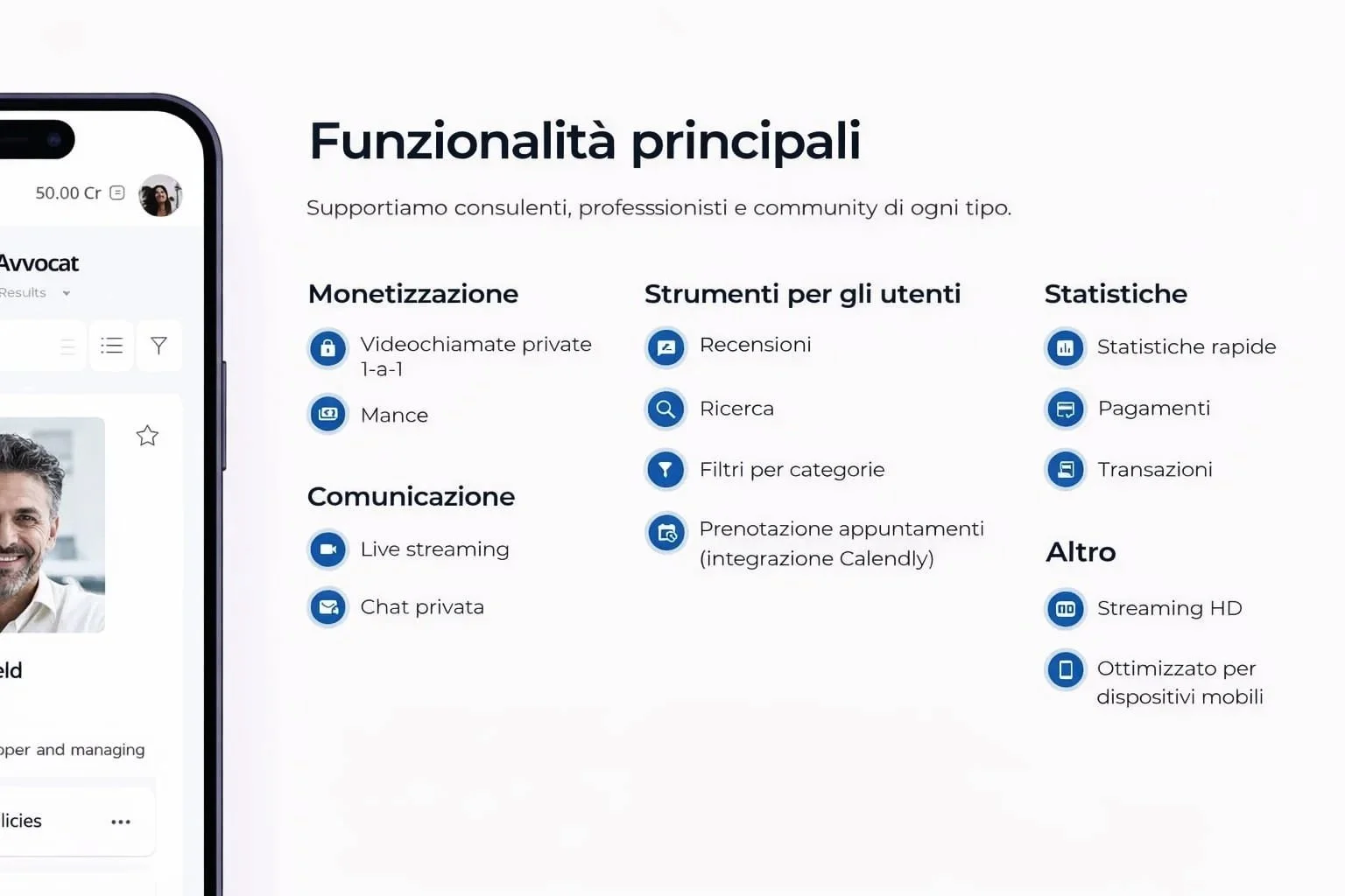 Una piattaforma dedicata a coach, consulenti e professionisti che vogliono offrire sessioni private, video call e contenuti premium.