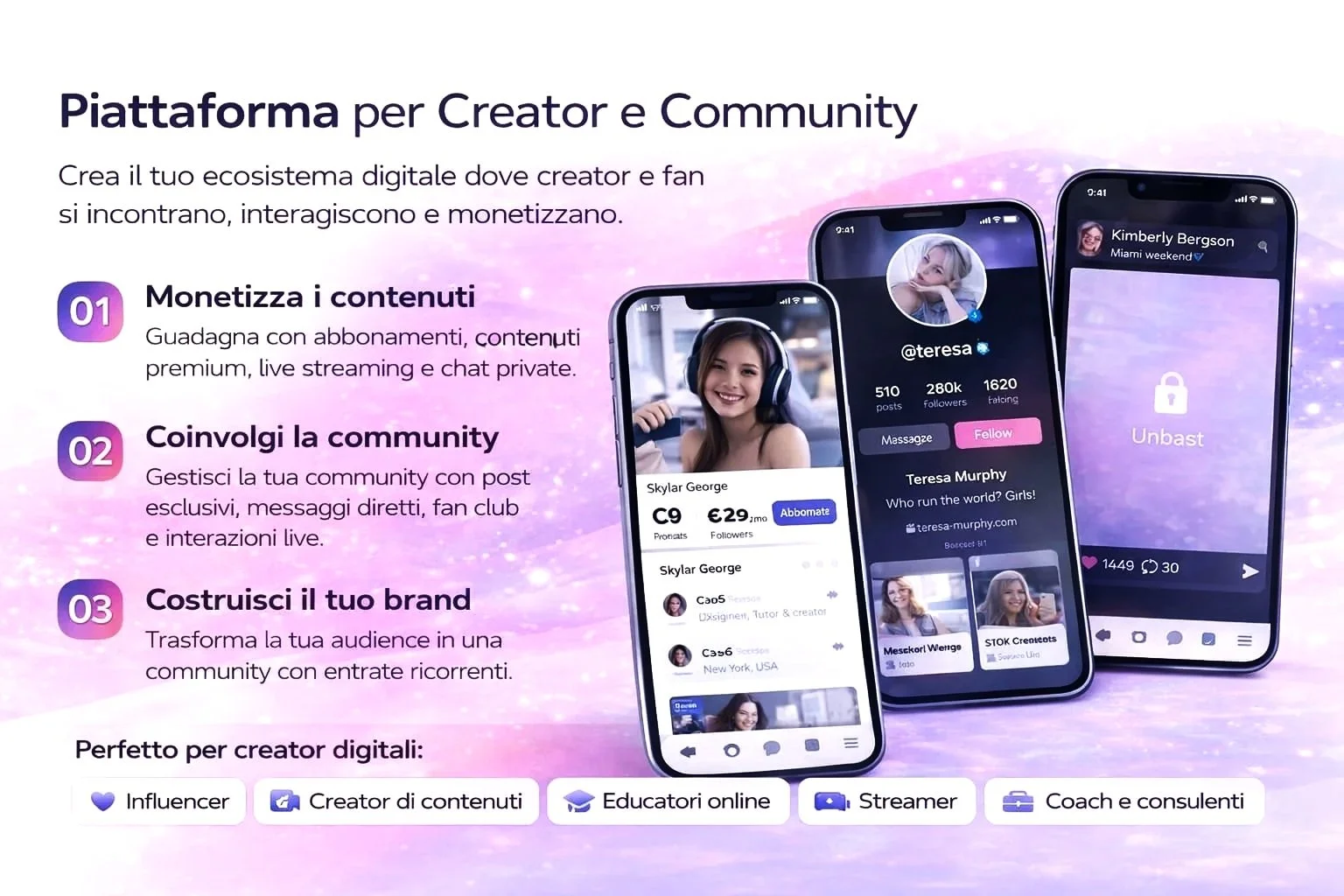 Piattaforme per creator che vogliono monetizzare contenuti, community e fan base attraverso abbonamenti, contenuti esclusivi e interazioni private.