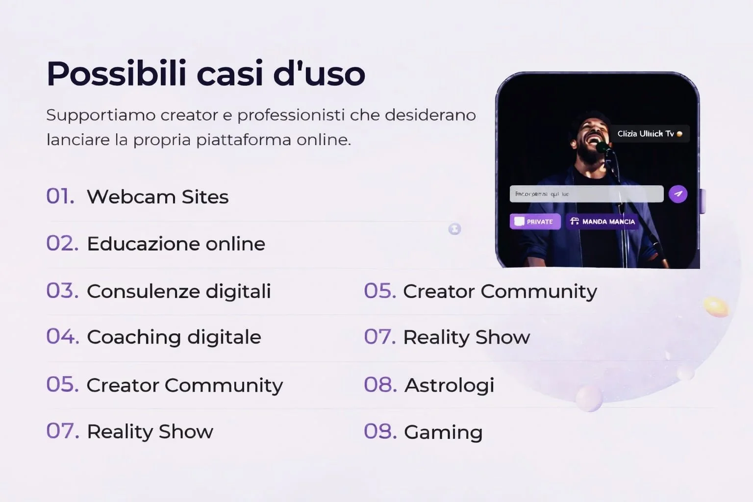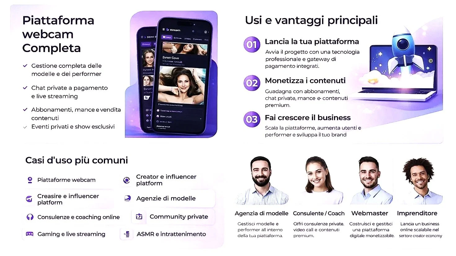 Puoi lanciare diversi tipi di piattaforme digitali: siti webcam, community di creator, marketplace di servizi, piattaforme di consulenza online o siti per creator singoli.